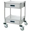Xe đẩy được bố trí 2 tầng, bề mặt các tầng được thiết kế với 4 gờ chắn giữ đồ vật hoặc chất lỏng không bị rơi rớt trong quá trình sử dụng, dưới các tầng được lắp các hộc ngăn kéo